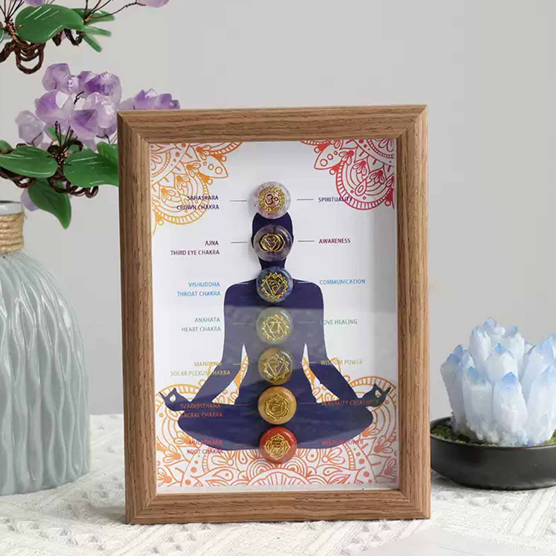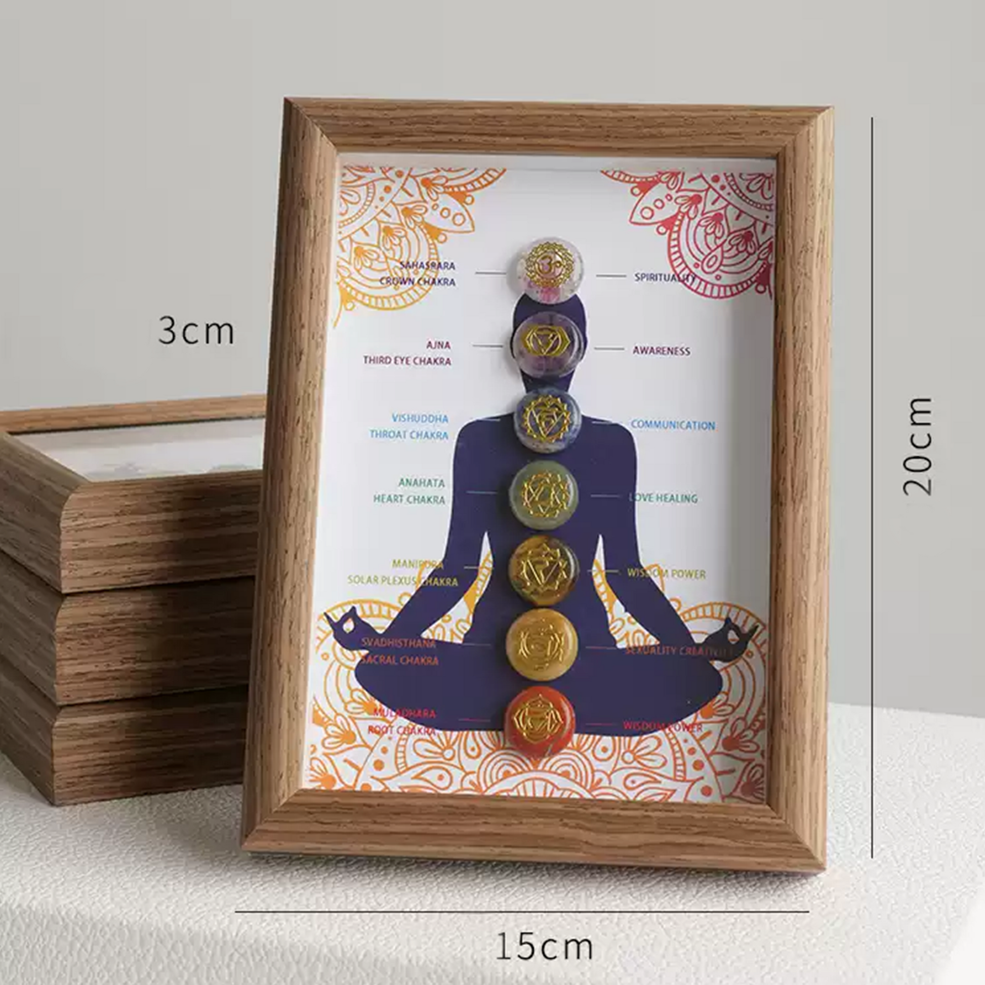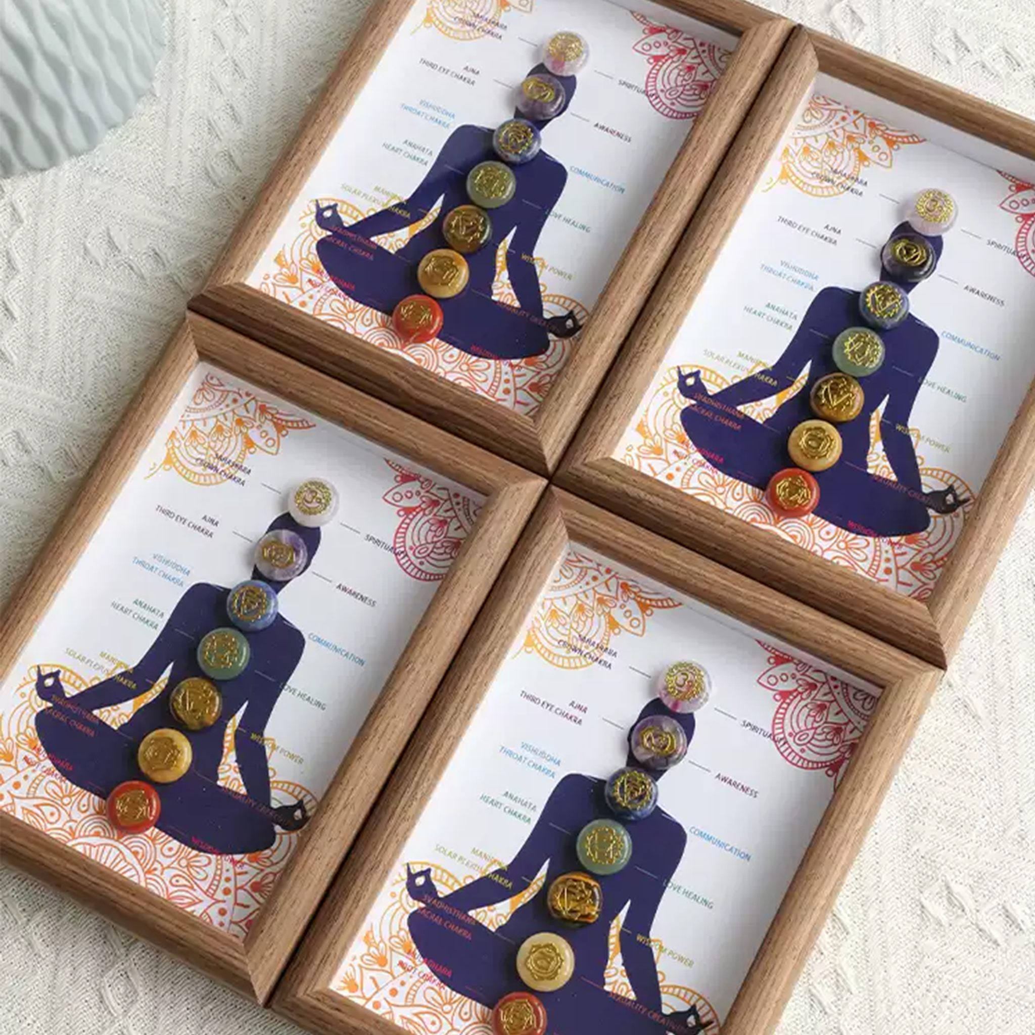 Bringen Sie Balance in Ihren Raum. Unser „Chakra Harmony“-Rahmen ist ein wunderschön kuratiertes Stück spiritueller Kunst, das die sieben Energiezentren des Körpers in Einklang bringt. Mit sieben hochschwingenden Heilsteinen, die mit heiligen Symbolen graviert sind, dient dieser Rahmen sowohl als atemberaubendes Dekorationsstück als auch als kraftvoller Fokuspunkt für Ihre Meditation oder Yoga-Praxis. Reiki-geladen , um Ihre Umgebung zu harmonisieren und Ihre spirituelle Reise zu unterstützen.