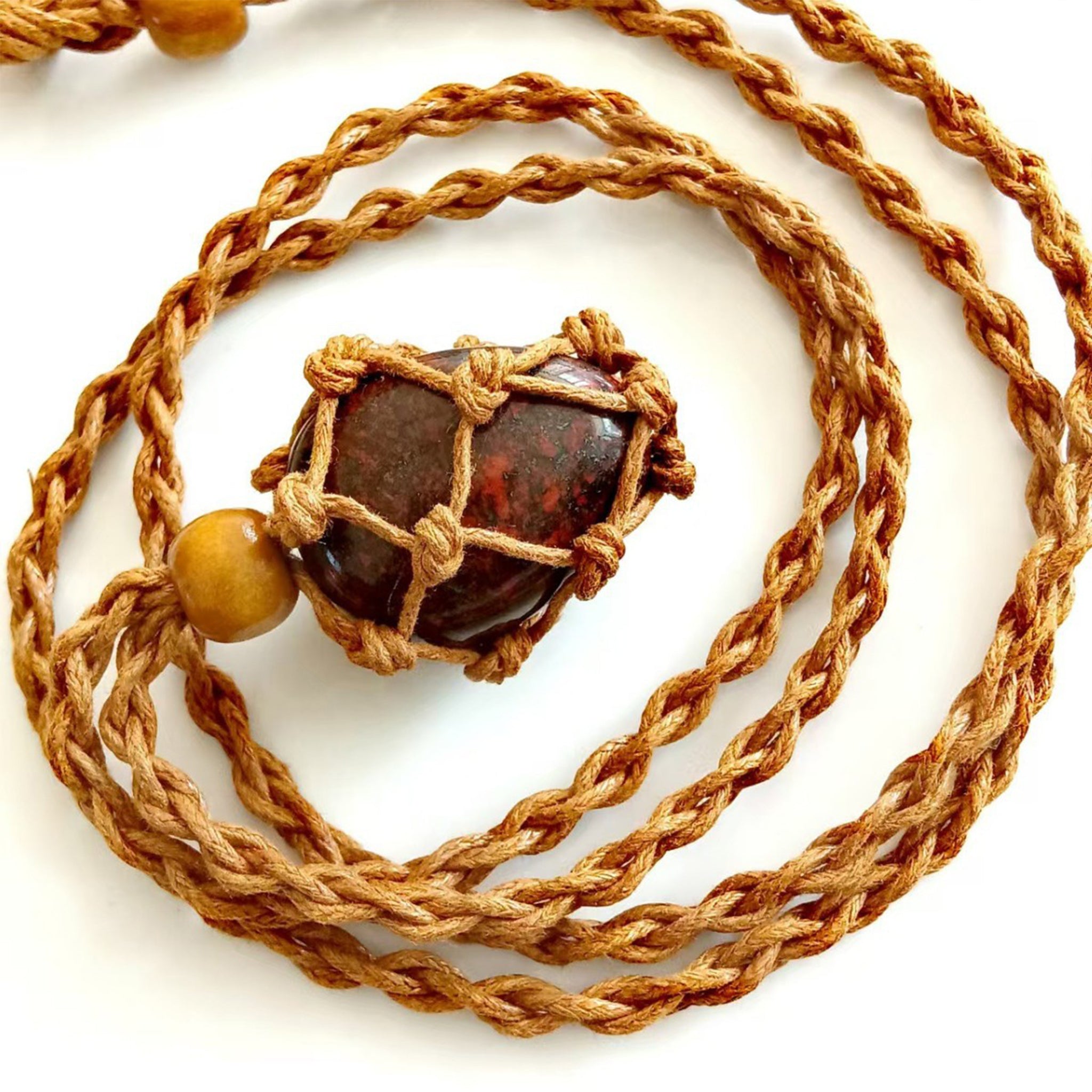 A: Wir empfehlen, deine Makramee-Halskette vor dem Duschen oder Schwimmen abzunehmen, um die Unversehrtheit des Naturseils und die Energie des Steins zu erhalten.