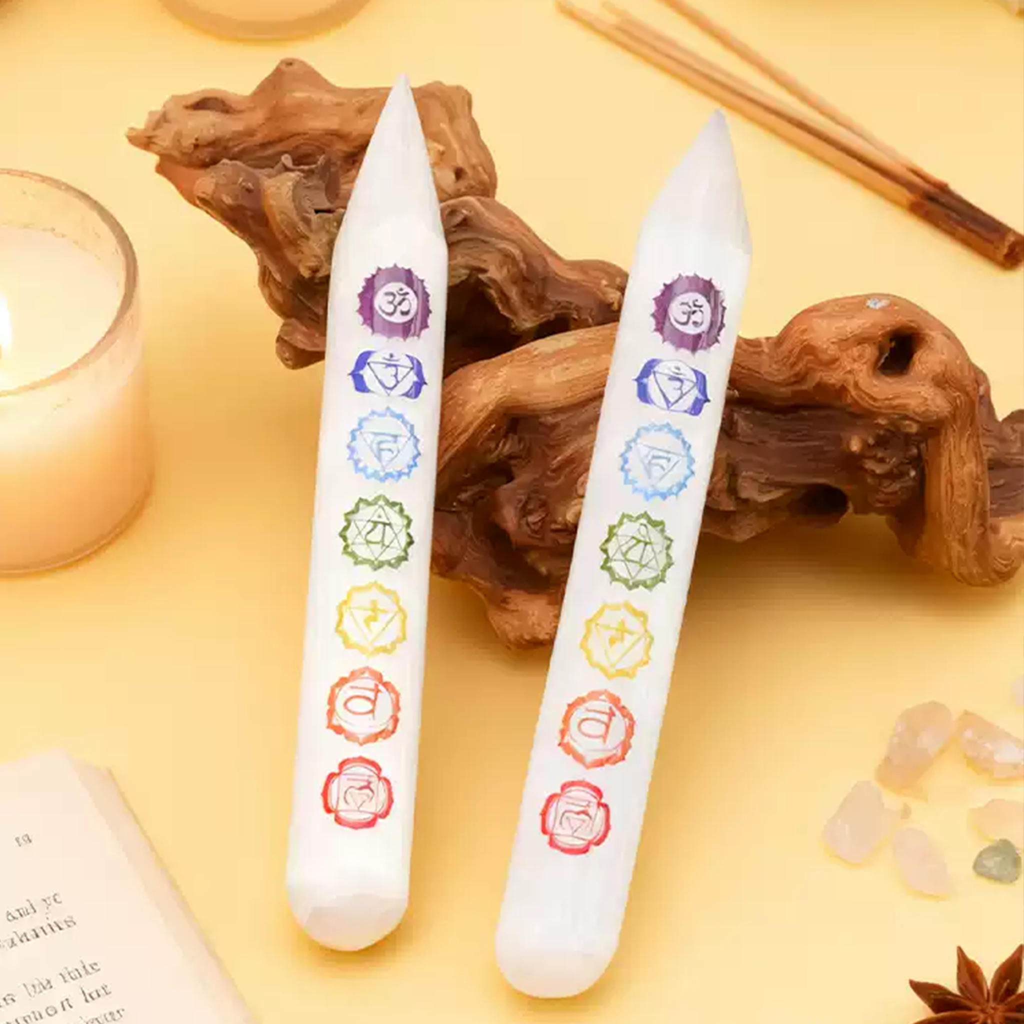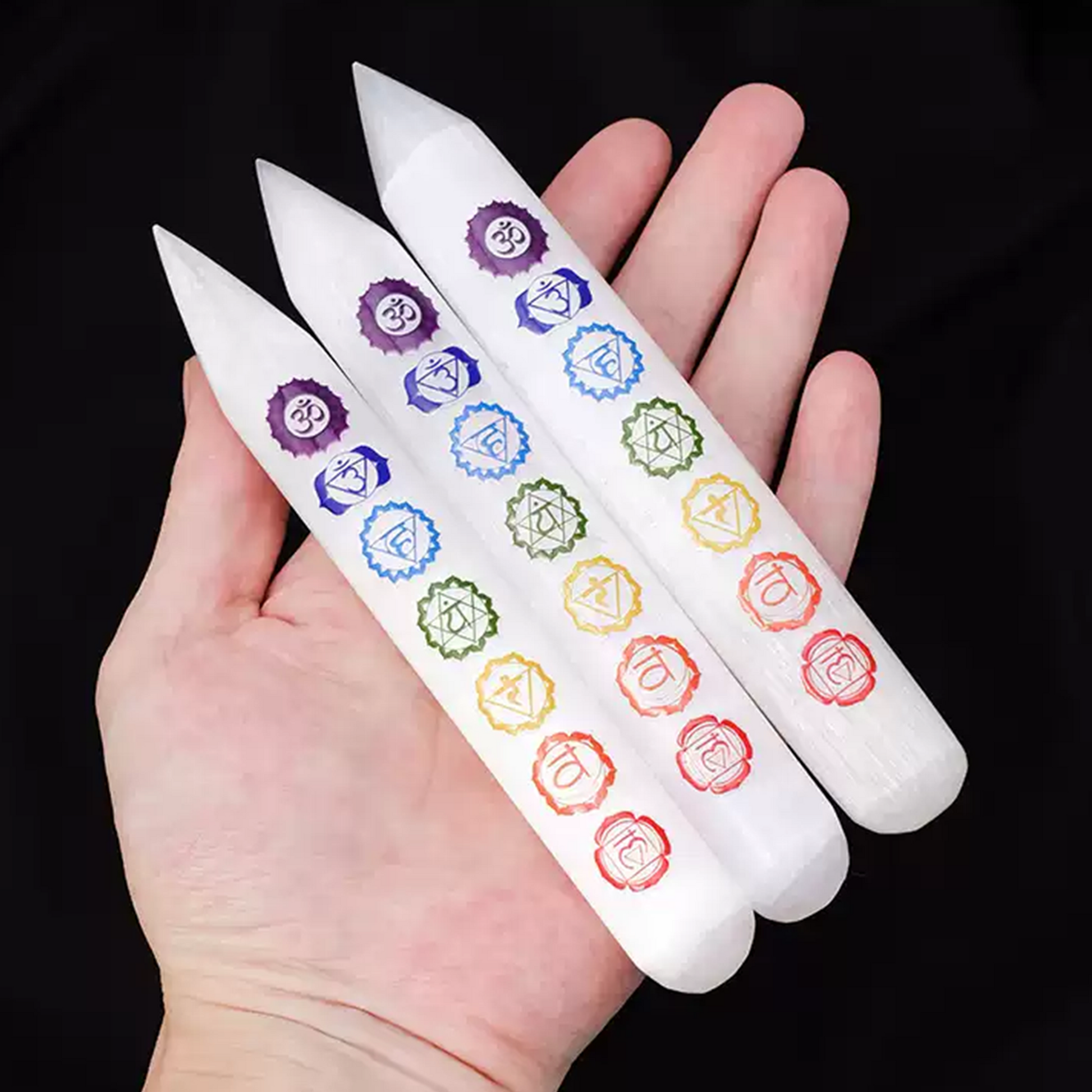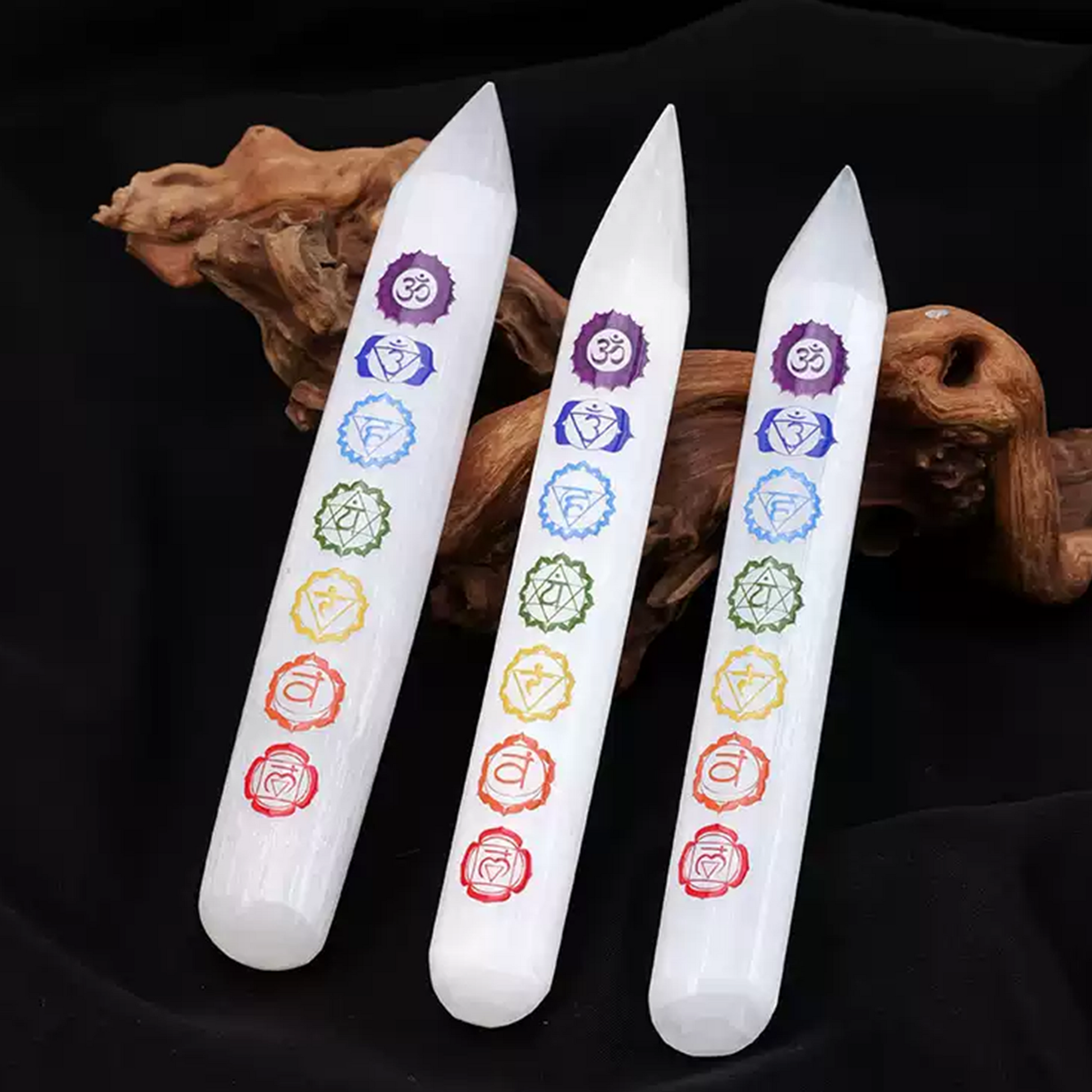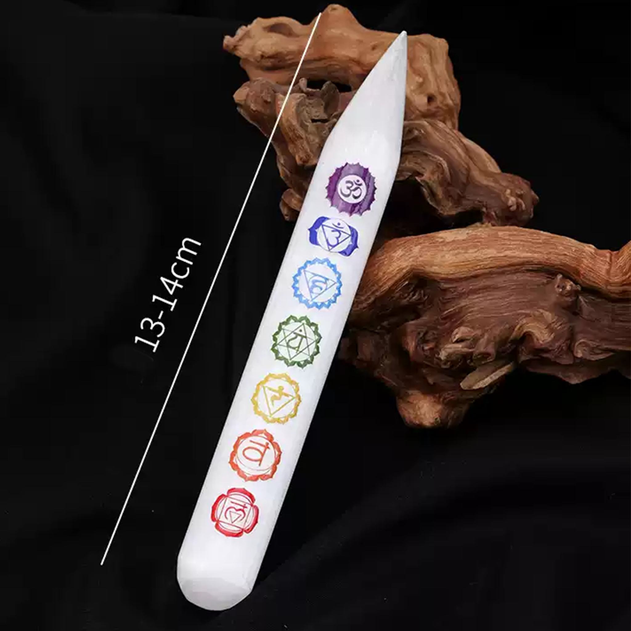 Selenit ist der „Stein des flüssigen Lichts“. Er wird von Energiearbeitern wegen seiner Fähigkeit geschätzt, energetische Ablagerungen zu beseitigen, wodurch deine Aura und dein Raum sich leicht, weit und friedlich anfühlen. Kombiniert mit der alten Weisheit der 7 Chakren, ist dieser Stab dazu konzipiert, dir zu helfen, während deiner Praxis die physischen und spirituellen Bereiche zu überbrücken.